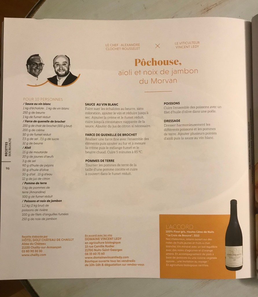 Collaboration été 2024 avec le chef Alexandre Clochetet Rousselet de l’hôtel golf château de Chailly- accord mets et vin autour de notre Pinot gris 2022